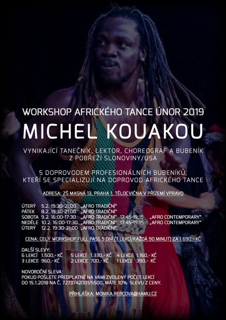 Jedná se o workshop afrického tradičního i současného tance s MICHELEM KOUAKOU, původem z Pobřeží slonoviny, který mnoho let žije a vyučuje v USA. Přivítáme ho v Praze na workshopech od 5.2. 2019 do 12.2. 2019. Máme se opravdu na co těšit. Profesionální lektor plný energie, vysoce talentovaný choreograf a tanečník, který obdržel za svoje umělecké působení mnoho cen v USA !