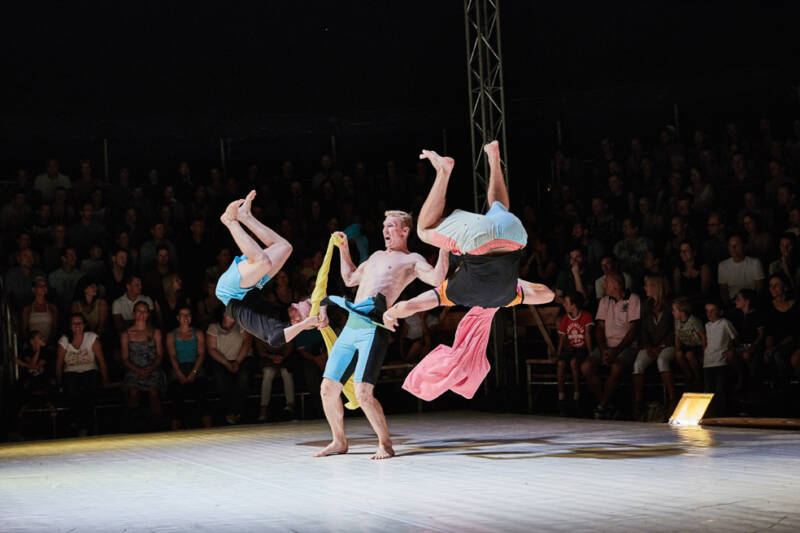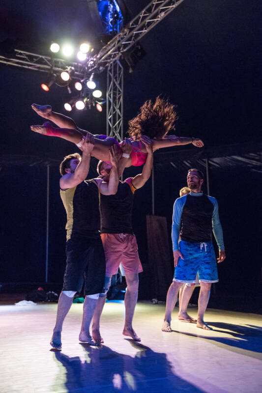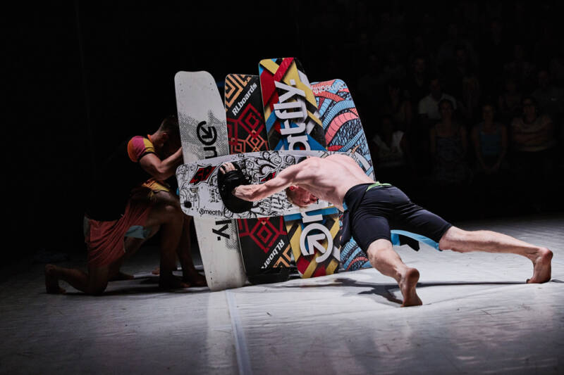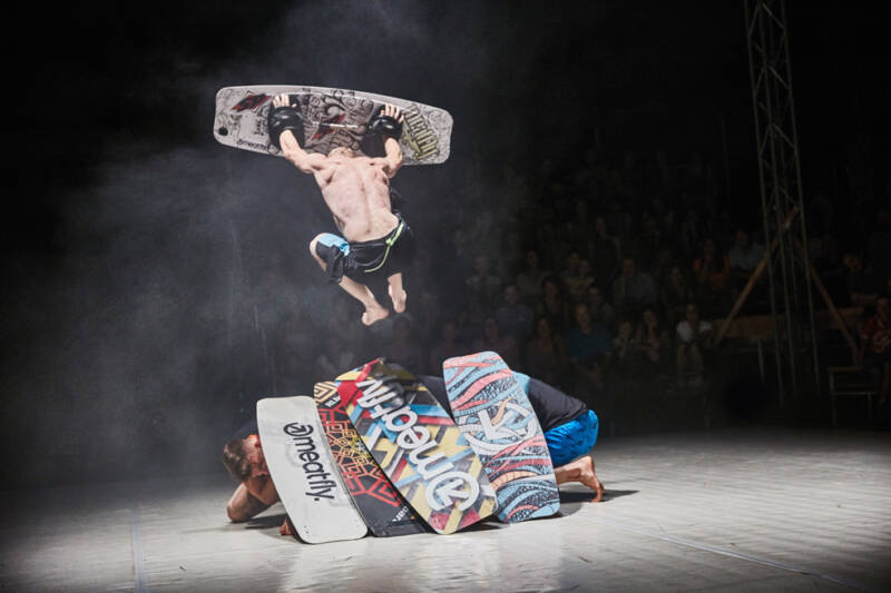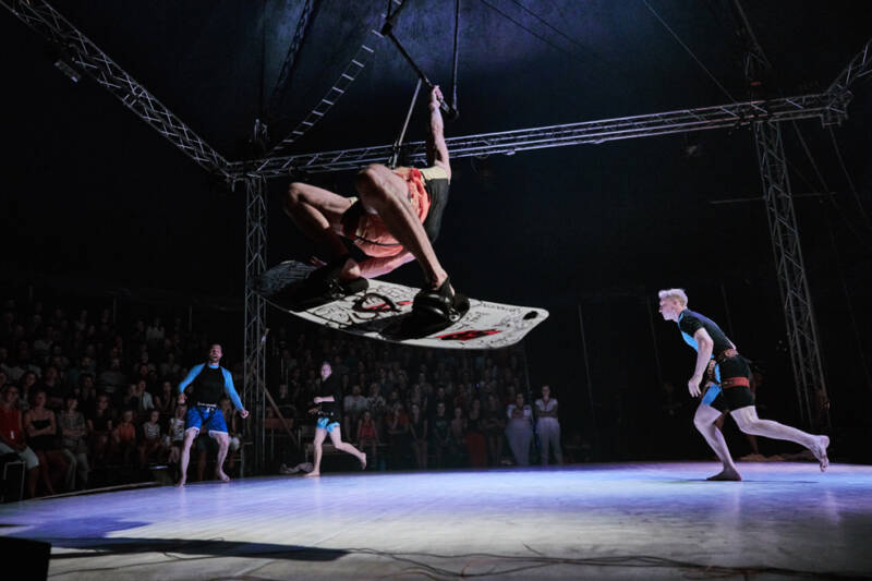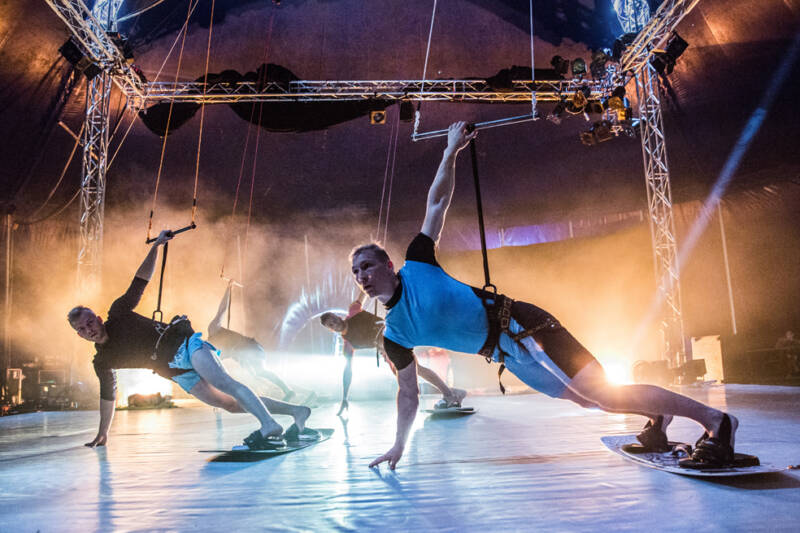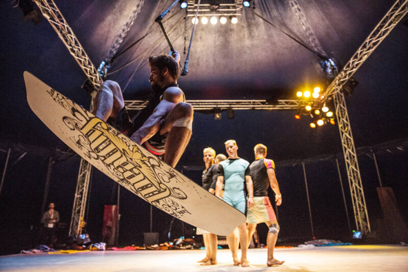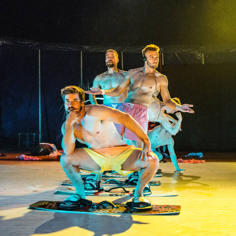 A navíc ještě ostatní ‚poskakují‘ kolem a ovívají ji. Dalo by se říci, že jí místo ‚modrého z nebe‘ snesli vítr z nebe. Krásně provedené číslo, kdy těla akrobatů vytváří jakousi vlnu, po které plave surfařské prkno. Jeden z chlapců má zřejmě úspěch, zdá se, že láska je tu. A honem spolu do stanu! Zatímco se schovává s dívkou ve stanu a prožívá radost z lidské blízkosti, ostatní se opět pokouší využít chvilky, kdy fouká vítr. Vlny a plavání na nich jsou krásně vyj& aacute;dřené akrobacií. Za chvíli vybíhá ještě téměř nahý kamarád ze stanu a snaží se také dohnat, co se dá, protože fouká, konečně fouká!!!! Všichni na prkna!
