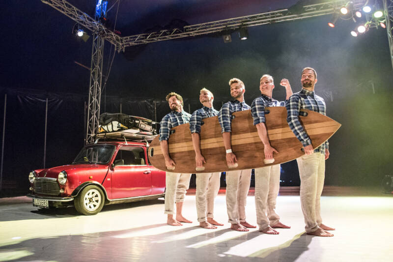 Za scénou slyšíme hluk motoru, malé směšné autíčko, odshora dolů nabalené věcmi, zvesela zavrčí, na pláž přijíždí skupinka nadšených kluků. Mají s sebou surfařská prkna a radostně a hlasitě si zpívají, dovolená začíná…