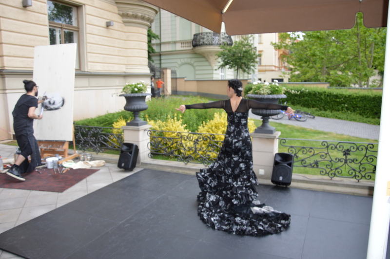 Emilio Fornieles při zahájení své vernisáže také představil „action painting“ – tvorbu portrétu před publikem během 60 minut, na vlastní námět speciálně určený pro Prahu, za doprovodu tanečnice flamenca Virginie Delgado a flamencového kytaristy Morenita de Triany.
