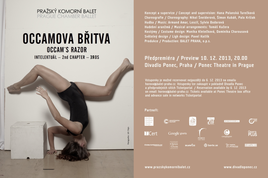 Pražský komorní balet v úterý 10. prosince v Divadle Ponec poprvé uvede originální projekt „Occamova břitva“, který podpoří mladou generaci českých a slovenských tvůrců. Večer představí práci vybraných talentovaných tanečníků a choreografů působících v souboru či studujících choreografii na HAMU – Nikol Šneiderové (PKB), Šimona Kubáně (PKB) a Pala Kršiaka (HAMU). Všichni tři získali možnost profesionálně tvořit v Pražském komorním baletu. Autorkou konceptu je nová umělecká vedoucí souboru Hana Polanská Turečková.