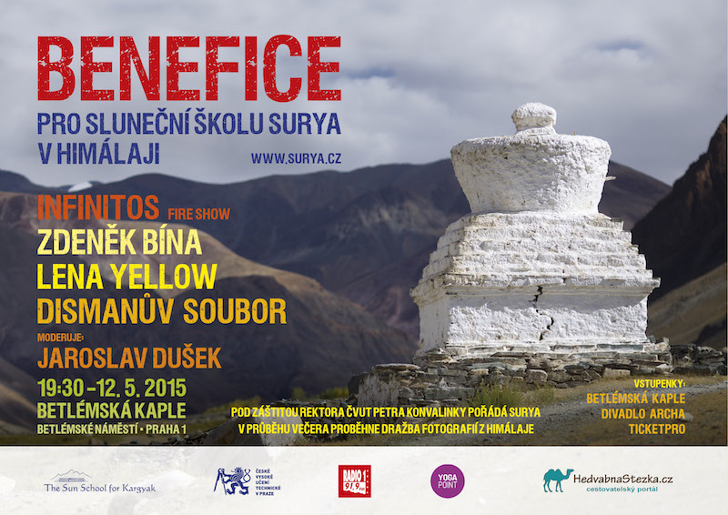 V pražské Betlémské kapli se 12. května uskuteční již šestý ročník Benefice pro Suryu, unikátní sluncem vytápěnou školu, kterou před lety jako svůj diplomový projekt postavil v indickém Kargyaku Jan Tilinger. Sdružení Surya zajišťuje provoz této školy včetně nákupů učebních pomůcek či platů místních učitelů v této jinak izolované a těžko přístupné části indického Himálaje. I letošní ročník bude moderovat vynikající český herec a improvizátor Jaroslav Dušek a představí se Dismanův rozhlasový dětský soubor, kytarista Zdeněk Bína nebo Lena Yellow (z uskupení Yellow Sisters). Dveře kaple se otevřou v 19:00, v 19:15 vas p ivítá před kaplí seskupení Infinitos se svojí fire show. Vstupenky různých kategorií jsou v prodeji v Divadle Archa, Ticketpro a Betlemské kapli.