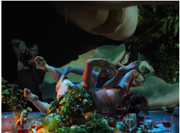 Slavnostní večeře, která se změní v dobrodružnou výpravu do makro a mikrosvěta. Živé obrazy pořizované tanečníky ruční kamerou nás provedou bizarním paralelním světem organických objektů. Metoda filmového snímání společně s akustickou deformací vytváří metaforu barokní zahrady, pozemsky lahodnou, ale stejně určenou k nevyhnutelnému zániku.