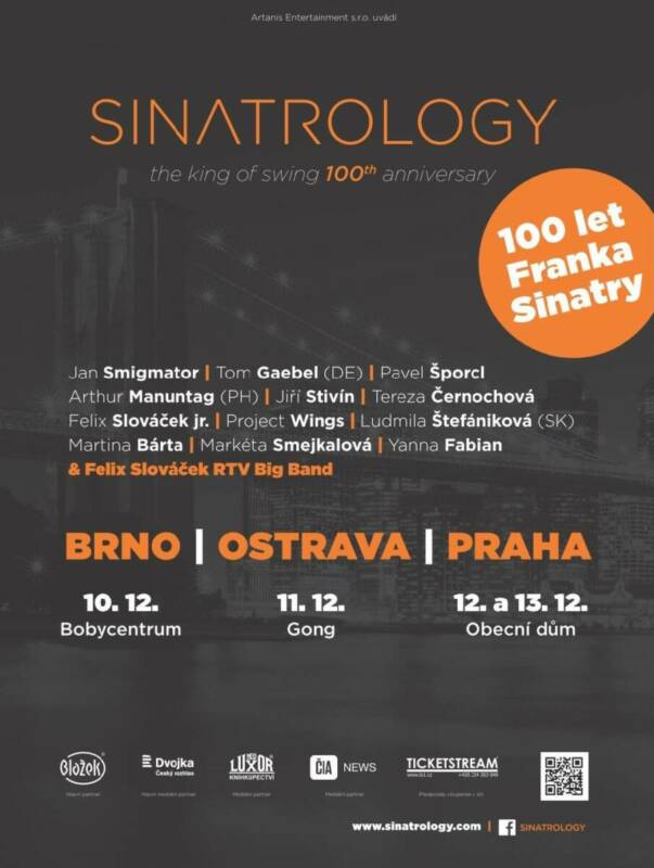 Král swingu Frank Sinatra by na konci letošního roku oslavil jubilejní 100. narozeniny. Oslavy na počest hudební legendy se odehrají po celém světě a Česko nebude výjimkou. Koncertní turné s názvem Sinatrology vyvrcholí 12. prosince v Praze přesně v den narozenin velkého šéfa. Špičkový český i mezinárodní swing si v prosinci užijí i moravské metropole. Pro velký zájem o vstupenky pořadatelé přidali koncerty 10. 12. v brněnském Bobycentru a 11. 12. v ostravském Gongu.