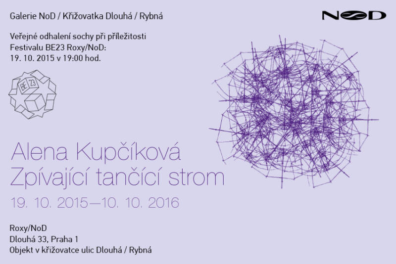 V rámci zahajovacího večera narozeninového festivalu BE 23, kterým začínají oslavy výročí založení klubu Roxy a Experimentálního prostoru NoD, odhalí Alena Kupčíková svou monumentální intervenci v prostoru křižovatky ulic Dlouhá a Rybná. „Zpívající tančící strom“ – zavěšený kinetický objekt, vytvořený z více jak sto deštníků a hliníkové konstrukce – roztančí veřejné prostranství před legendárním klubem v centru Prahy. Alena Kupčíková svým aktuálním dílem navazuje na tradiční roční venkovní instalace, kterými Roxy/NoD kultivují lokální veřejný prostor. Odhalení objektu proběhne 19. 10. 2015 v 19:00 v Experimentálním prostoru NoD.