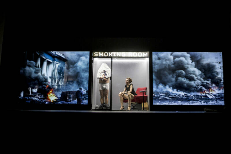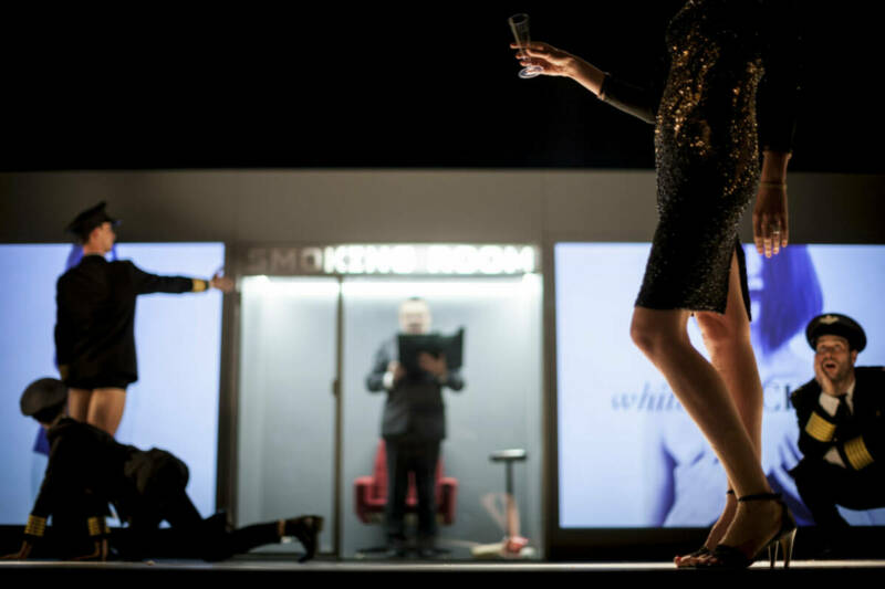 Duo, které mělo na starost takřka celý (ovšem seškrtaný a doplněný o souvislosti s Ruskem) text, doplňoval čtyřčlenný „sbor“, který se postaral o většinu pohybové složky představení. Ti zastupovali jednou společnost, podléhající vlivu ikonických obrázků v módních časopisech, jindy služebníky hlavních postav v převleku letců a letušek. Režie Petra Boháče se snažila o kritiku pokrytectví ruských představitelů, když nadávají na „dekadentní“ západní svět, ale sami se vyžívají v podobně dekadentních zábavách a ve skutečnosti svou rétoriku staví na manipulaci a populismu. Umělci v projekcích v zadním plánu jevi&sc aron;tě vyjevovali také některé principy mediální fikce (manipulace skrze glamour, zkreslené informace v televizi atd.). Co ale přesto chybělo, byl určitý nadhled. Snaha o pochopení, proč běžní Rusové většinou schvalují počínání své politické špičky, co je přivádí do rozporu s námi a co nás nutí znovu zaujímat pozici, že Rusko nás ohrožuje a chce nás mocensky ovládnout. Nadhled nad těmito pocity se v představení objevil jen zřídka a výkladem negativních věcí, za které je Putinovský režim bezesporu zodpovědný, nás spíše utvrdil v tom, na které straně barikády stojíme.