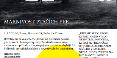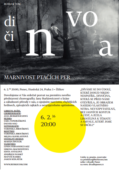 Divočina Premiéra nového představení choreografky Jany Burkiewiczové o kráse a záludnosti přírody v nás, o opojném narcismu, chybějících hrdinech, zpívajících rajkách a nevyzpytelném optimismu Taneční magazín