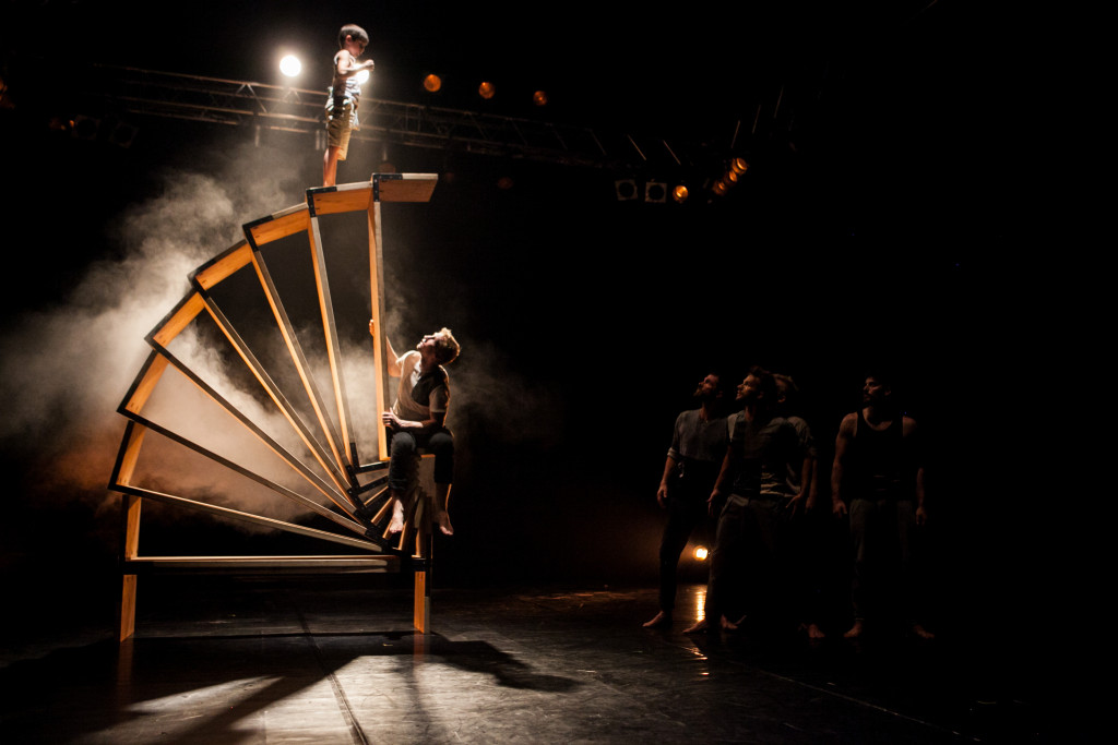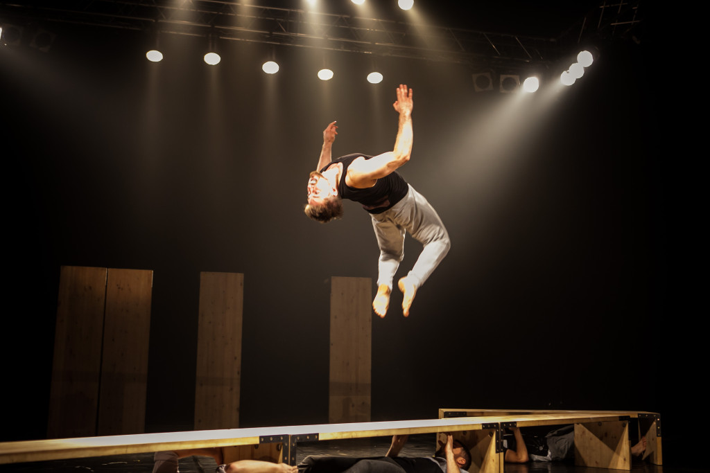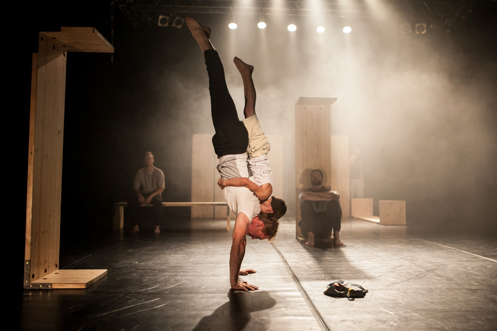 Tentokrát akrobaté zvolili jednoduše řešenou scénu, pouhých 8 lavic, které ztělesňují tu sídliště, tu prales, tu Divoký západ. Hravě a hbitě  pracují s lavicemi, po kterých se pohybují způsobem, který budí dojem, že pro tyto  umělce zkrátka  neplatí gravitace jako pro ostatní smrtelníky. Sledujeme dynamický rej těl, akrobaté jsou hned u, hned nad či pod lavicí…