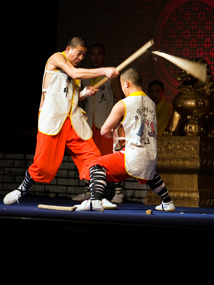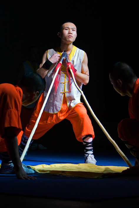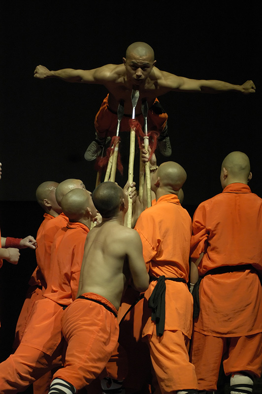 Na plátně se objevuje chrám, tlumené modré  světlo osvítí mnicha, který medituje.  Před chrámem mniši nacvičují bojové techniky. Dítě  se v rámci cvičení postaví na ostří nožů a chvíli tak stojí. Bez zranění. Napíchne se na ostří břichem, bez zranění.  Jiný mnich rozbíjí cihlu o břicho,  točí se na ostré tyči, nebo ji láme. Vidíme cvičení s palicí, jeden mnich ji přerazí druhému o nohu, záda, břicho. Vrchol nastává, když ji přerazí o hlavu (ale nám se to prý nedopo ručuje napodobovat!)