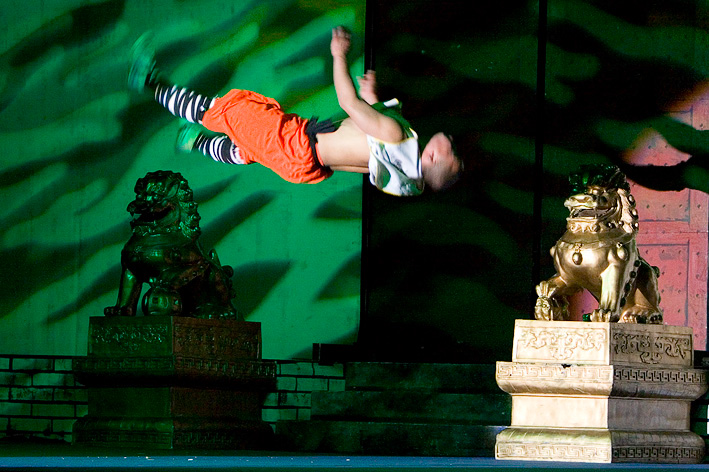 Rychlé, dynamické pohyby, demonstrace rychlosti a mrštnosti, jevištěm hřmí nezbytný bojový ryk.  Děti nezůstávají ve svých dovednostech v ničem pozadu. I dítě ‚metá kotrmelce‘ rychlostí blesku, jeden za druhým, zřejmě ti, nepříteli, unikne.