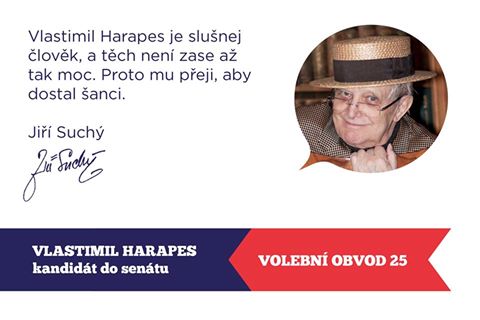 Vlastimil Harapes to nemá ze svého bydliště na Malé Straně do Parlamentu ani Senátu příliš daleko. V Praze, kde se do Senátu v roce 2016 volilo pouze v několika mělo obvodech, tak kandidoval ve volebním obvodě Prahy 6 (který se však detailně nekryje s se správním územním celkem Praha 6!). Přesně v té Praze 6, kde pan Harapes pro změnu účinkuje v legendárním Divadle Semafor. Jeho majitel, provozovatel a principál v jedné osobě Jiří Suchý také voličům Vlastimila Harapese doporučil. Postavil se za něj stejně jako jeho pěvecká kolegyně Leona Machálková a další z řad umělců.