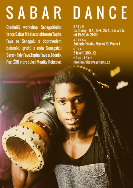 Ojedinělý workshop Senegalského tance Sabar Mbalax s lektorem Tapha Faye ze Senegalu od utery 11.4.2017 s doprovodem bubeníků griotů z rodu Senegalců Serer – Faly Faye a Tapha Faye a Zdeněk Pec (CR) v produkci Moniky Rebcové.