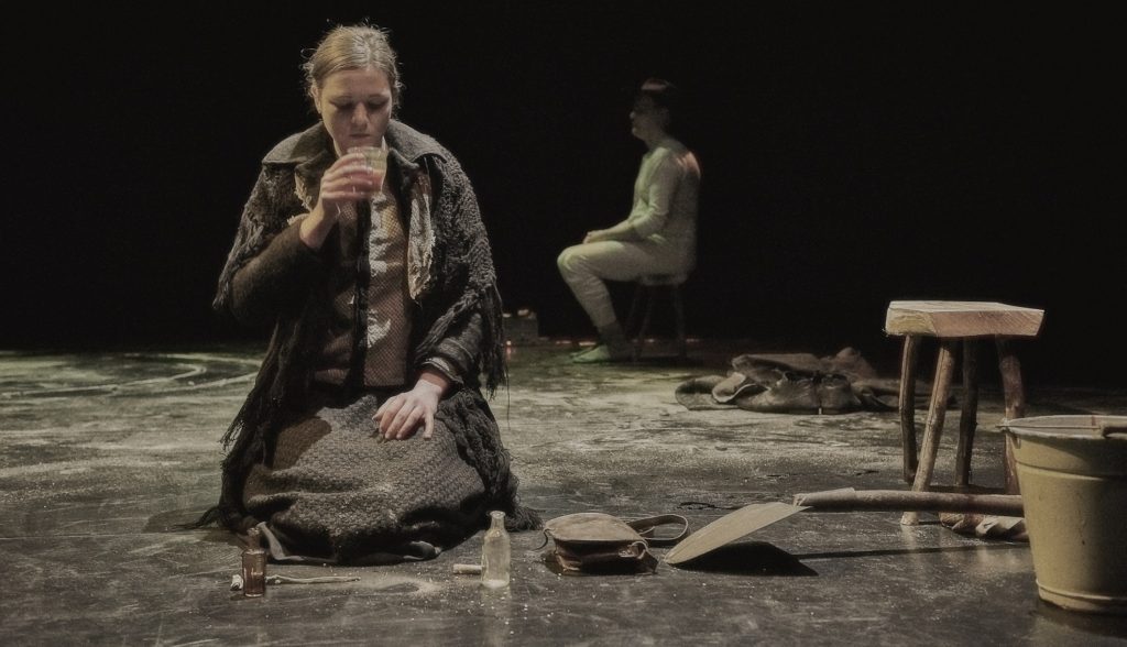 Další žena na jevišti opět nekonečně dlouho táhne nebohé tělo z místa činu, pečlivě ho omývá, snad i důstojně pohřbívá. Nebožtík ovšem vstává, bere si klobouk a svléká se do spodního prádla. Proč? Vyrazil si snad z hrobu na vycházku? Ještě několikrát během hry tento proces zopakuje. Obléká se a vysvléká, z naprosto neznámých příčin. Je mu snad po smrti trochu přespříliš teplo? Vytápí se snad v záhrobí nad míru? Jediná příjemná věc je v této chvíli hu dební doprovod. Diváci se lehce vrtí a jejich výrazy hovoří o jistých pochybách….