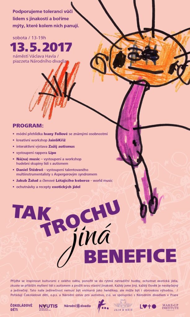 V sobotu 13. května 2017  (13-19h) se na náměstí Václava Havla /piazzetě Národního divadla koná TAK TROCHU jiná BENEFICE, odpoledne plné zábavy, dobrého jídla a jinakosti. Pořádají Čokoládové děti spolu s Národním ústavem pro autismus ve spolupráci s Národním divadlem v Praze.