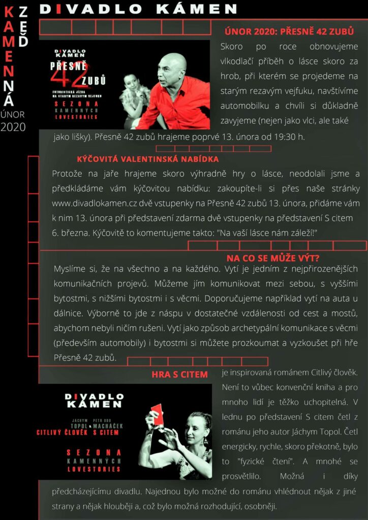 Protože na jaře hrajeme skoro výhradně hry o lásce, neodolali jsme a předkládáme vám kýčovitou nabídku: zakoupíte-li si přes naše stránky www.divadlokamen.cz dvě vstupenky na Přesně 42 zubů -13. února, přidáme vám k nim 13. února při představení zdarma dvě vstupenky na představení S citem – 6. března. Kýčovitě to komentujeme takto: „Na vaší lásce nám záleží!“