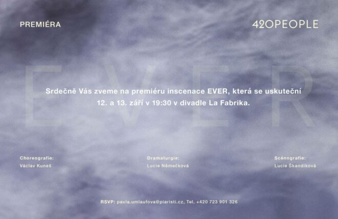 Kdo jste, když se nikdo nedívá? A kdo jste, když vás pozorují? Možné odpovědi nabídne připravovaná inscenace EVER tanečního souboru 420PEOPLE. Nejnovější choreografie Václava Kuneše vzniká v ověřené spolupráci s dramaturgyní Lucií Němečkovou. Současná minimalistická scénografie Lucie Škandíkové, nadčasové kostýmní zpracování designérky Olo Křížové a neutichající tempo elektronické hudby ve speciálním setu od jednoho z nejvýraznějších českých DJs a zvukového mága Ladislava Zensora alias Exhausted Modern přenese diváky na intimní místo, kde čas a ani prostor nehrají roli. Premiéra se uskuteční 12. a 13. září v divadle La Fabrika.