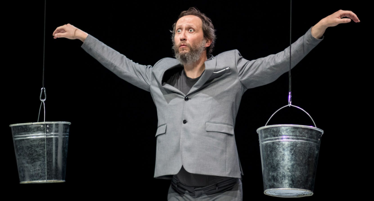 Pět klaunů v elegantně padnoucím saku přichází s tíživou otázkou Být či nebýt – tak tíživou, že by aspoň jeden z nich měl zhubnout. Pět klaunů vytyčuje cestu – a nikdo se neptá, kde se tu ty tyče vzaly. Logika snu a absurdita každodennosti, které se obřadně smíchávají v zavěšených kbelících. Ale stačí jen zaškobrtnout a je to všechno v kýblu!