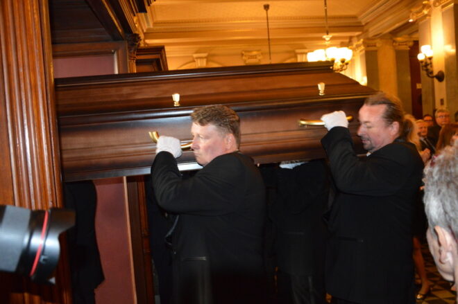 Rakev s ostatky byla za velkého potlesku vynesena hlavním vchodem do Národní ulice, kde ve spolupráci s policií byla na tři minuty zastavena doprava.  Rakev byla naložena do pohřební limuzíny a odvezena na kremaci.