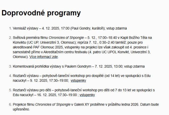 Součástí výstavy bude také světová premiéra filmu Chronicles of Shpongle v rámci festivalu PAF Olomouc 2025, propojující film, galerijní instalaci a performativní fikci do komplexního zážitku.