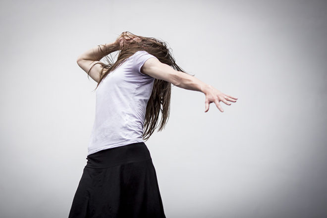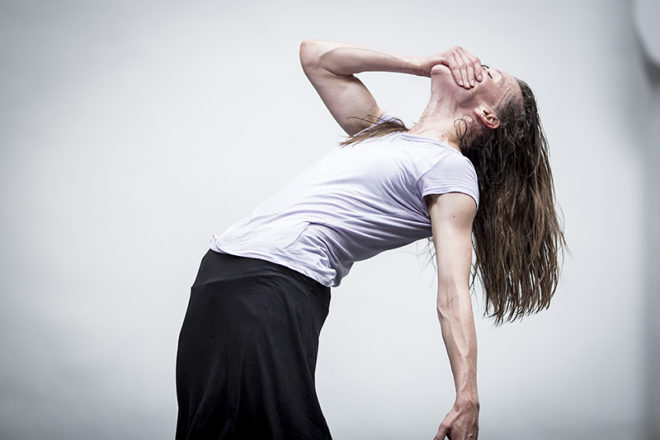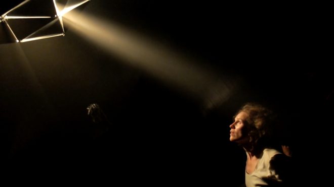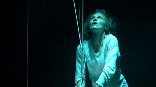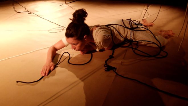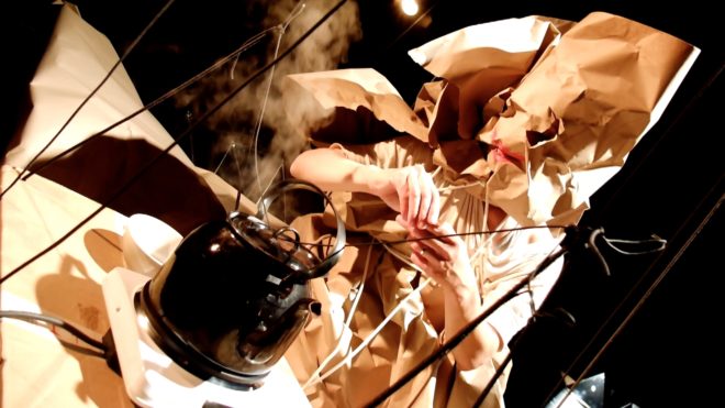 První, co diváka zaujme, je podivná scéna, na zemi leží plno šňůr, další visí ze stropu, vše zahalené dýmem. Sedící postava, spíše spící než bdící, pomalu tahá jednu ze šňůr. Hodnou chvíli se nic zásadního neděje. Druhá postava se k ní připojí, znenadání je její bezvládné tělo taženo šňůrou. V určité fázi toto bezvládné tělo najednou ožije, tahá celou šňůru zpět a plazí se po podlaze. Sbírá celé hrsti šňůr. Táhlý protivný zvuk z reproduktoru dráždí lidské smysly. Hromada šňůr je už sesbíraná, osoba si ji dává na hlavu a vytváří si z nich jakousi helmu, poté ji vytahuje ke stropu jako oběšence. V tomto okamžiku se postava doslova koupe v záři různobarevného světla. (V představení je neobyčejným způsobem pracováno se světlem, téměř se dá říci, že světlo je také jedním z hlavních hrdinů.) Osoba provádí krkolomné figury na šňůrách, zdá se, že je úplně volná a svobodná. Mezitím se dolů snáší stolek s konvicí a s třísknutím dopadne. Zvuk z reproduktoru se také mění, v neméně protivný než ten předchozí. Oso ba zalézá pod papíry, schovává se a zabalí se do něj. Poskakuje v papíru a pere se s ním. Šňůra nyní poslouží jako pásek, hlavní hrdinka si ji ováže kolem pasu a nyní má na sobě jakýsi podivný oblek, ve kterém pobíhá sem a tam. Namaluje si výrazně červená ústa. Zdá se, že si sedá k siestě, vaří si čaj a rozdává jej divákům.