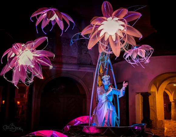 Interaktivita spočívá i v samotných performance, které zahradu oživují a počítají s těsnou blízkostí publika. Návštěvník tak může být obdarován svítící květinou v nadživotní velikosti, kterou performer právě vytáhl z obrovské vázy či se ocitnout uprostřed hejna zářivě bílých sokolů – loutek, které se vznášejí v ladné choreografii. Součástí zahrady je i svítící lotosový květ, zavěšený v 7 metrové výšce, sloužící vzdušné akrobacii. Oživlé obrazy doplňuje jemná hudební složka – zpěvačka na maličkém pódiu se skrývá v listech jedné ze zářících květin a brouká snové melodie.