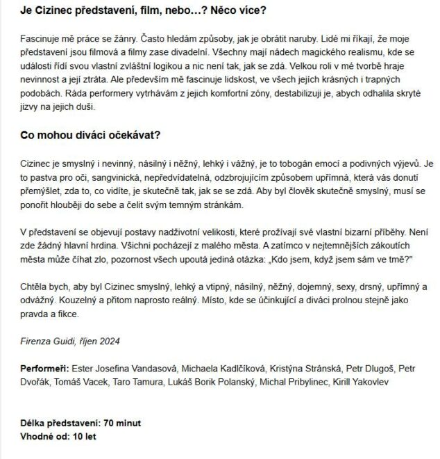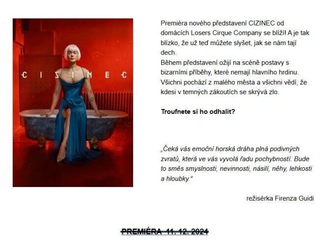 Losers vstup na vlastní scénu oslaví následně, na konci září, premiérou. Ke spolupráci přizvali přední osobnost současné české pantomimy Radima Vizváryho, držitele Ceny Thálie. A poprvé ve své historii uvedou představení pro rodinné publikum s názvem „MiMJOVÉ“. V hlavní roli se v alternaci představí Vanda Hybnerová či Anna Polívková. Začátek listopadu bude ve znamení další premiéry. Tentokrát novocirkusového kabaretu „Cizinec“. Opět v režii Radima Vizváryho s Janem Cinou a Erikou Stárkovou v hlavní roli. Více na www.divadlobravo.cz. Předprodej vstupenek v síti GoOut.