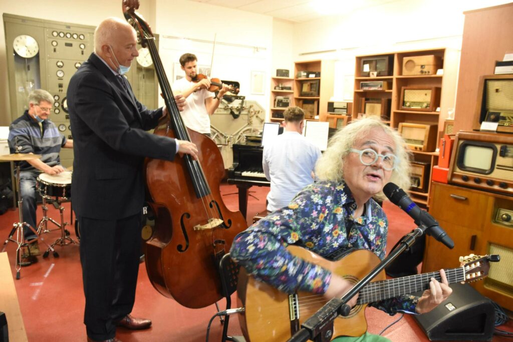 Herci populární Ypsilonky jsou nesmírně muzikální, což dokázali i na slavnostním zahájení výstavy Jana Schmida (v pozadí si všimněte historických rozhlasových artefaktů a rádii, jež jsou součástí trvalé expozice v „GALERII VINOHRADSKÁ 12″) (Foto: Eva Smolíková)