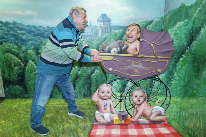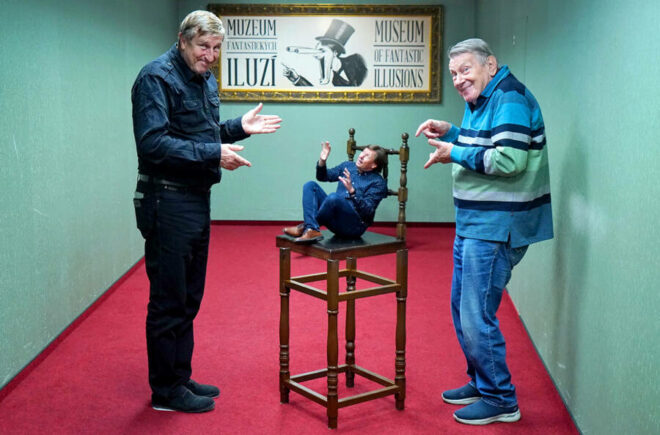 Josef Dvořák, který dorazil do Muzea fantastických iluzí i s manželkou Jarmilou, hýřil vtipem a evidentně dobrou náladou. „Pepovi je 82 roků a energie má na rozdávání. Hraje divadlo po celé republice a navíc odmítá řidiče, takže na představeních není jenom herec, ale i šofér,” uvedla hercova sympatická manželka. V muzeu se král a jeho ministři vyřádili doslova jako malí kluci. „Až tady jsem odhalil rodinné tajemství, že mám čtyři sourozence a navíc úplně stejně krásné jako já,“ žertoval Josef Dvořák, který si vyzkoušel starou zrcadlovou iluzi.