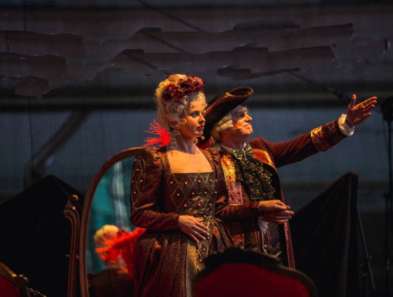 Představitelka císařovny Marie Terezie Vendula Fialová a vedle ní vpravo v rozmáchlém gestu Vladimír Hrabal jako František I. Štěpán Lotrinský