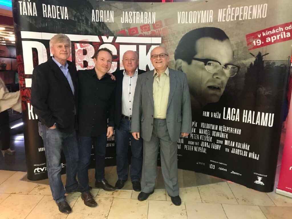„Prezident Svoboda v civilu“, po slavnostní premiéře filmu „Dubček“ spolu s hlavním kameramanem Peterem Kelíškem, režisérem filmu Laco Halamou a představitelem politika Františka Kriegela – hercem Zdeňkem Burešem