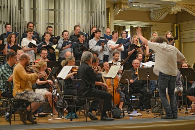 “ V 90. letech se začaly objevovat zajímavé ansámbly a jejich vedoucí, kteří nestudovali ani klasické dirigování či sbormistrovství, ale z úhlu violoncellisty, cembalisty či houslisty začali provozovat více méně profesionálně starou hudbu v tzv. historicky poučené interpretaci. Protože otázka frázování, zvuku, dobových temp atp. mě velmi interesovala už za studií, udělal jsem tlustý řez a založil nejprve příležitostný – nyní již stále pracující orchestr, sbor a sólisty CEB. Autentická interpretace mi najednou otevřela dramaturgický vesmír hudby od roku 1600 zhruba do 1800, a odpověděla mi na všechny otázky spojené s počáteční nedůvěrou ve vážnou hudbu. Baroko je vrcholem harmonie a hudební krásy, a má hodně společného právě třeba s pop music nebo dokonce jazzem. V únoru startujeme sezonu s velkým Handelem – překrásným oratoriem TRIUMF ČASU A PRAVDY, kde se představí všechny složky mého ansámblu – sbor, orchestr i sólisté. Cyklicky se věnujeme spolu s vydavatelstvím Supraphon – restauraci díla královského kapelníka – Čecha F. Ignáce Tůmy, máme před sebou překrásný projekt Vivaldi se světovým kontratenorem Andreasem Schollem, CD Molieri s Adamem Plachetkou, koncertní cyklus Bacha na Mozarta, festivaly a 20. ročník workshopu pro mladé profesionály – Letní školu barokní hudby na zámku Holešov.“