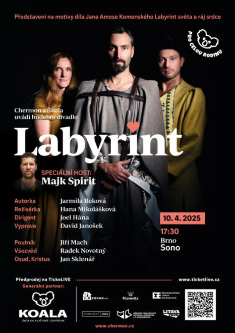 „Jedná se o největší divadelní představení v rámci odkazu Komenského. Premiéra proběhla 8. března 2020 v brněnském Sonu a datum napovídá, že to bylo dva dny před začátkem covidové pandemie. Labyrint však zůstal živý, máme za sebou vyprodané představení v Olomouci, Praze, ale i v Brandýse nad Orlicí, kde Komenský toto dílo psal. Jsme moc rádi, že se letos vrátí právě do Sona, které nabízí skvělé technické možnosti například co se týče světel, která jsou v tomto zpracování důležitým elementem. Představení začne už v 17.30 hodin, aby ho mohli navštívit i menší děti a je vhodnou alternativou například pro fanoušky muzikálů. Letošní novinkou je účast Majka Spirita, ze které máme velkou radost,“ říká za organizátory Klára Mars.