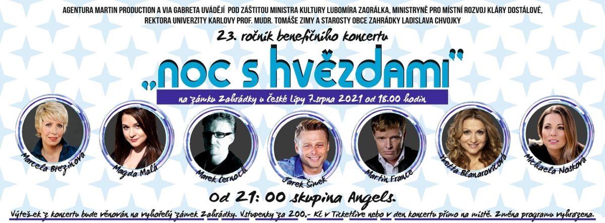 Letos se první srpnovou sobotu 6. 8. 2022 od 18.00 hodin opět potkají zpěváci a muzikáloví herci na legendárním benefičním koncertu Noc s hvězdami na zámku Zahrádky v libereckém kraji u města Česká Lípa a to již po čtyřiadvacáté.