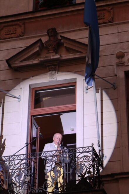 Po předávání šeku na úplný závěr dorazila na balkón radnice i česká hvězda showbusinessu pan Felix Slováček, který svými třemi skladbami na klarinet završil krásnou a důstojnou tečku za letošním benefičním koncertem.