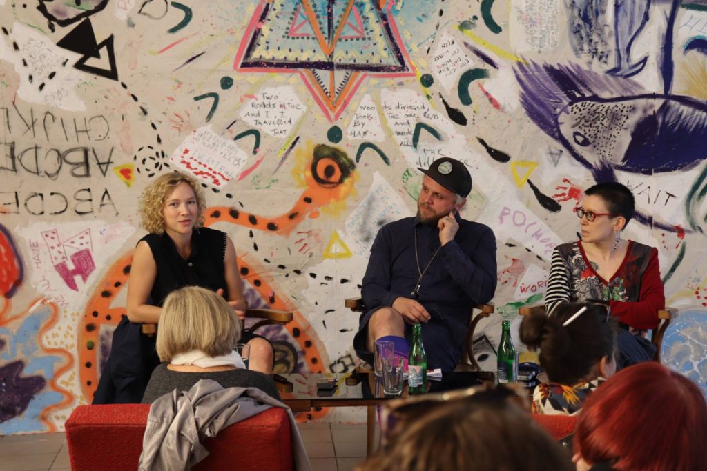 Na tiskové konferenci zleva: kostýmní výtvarnice a kaskadérka Petra Ptáčková, Rostislav Novák ml. a psycholožka Dr. Lenka Krejčová – v pozadí obří plátno, které namalovaly hyperaktivní děti
