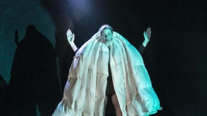 Diváci se na začátku děje ocitnou v pokoji po večírku v momentu, kdy se postavy probouzejí. Scénickou dominantou inscenace je postel, která je symbolem intimity, blízkosti, bezpečí, ale v depresivních stavech taky místem, kde se člověk uzavře do sebe a ze kterého nevstane týdny. Postupně se proměňuje a stává se krajinou, která nabude až mýtického rozměru. Na vizuální a zvukové koncepci se podílí audiovizuální umělec Michal Kindernay a hudebnice Iana Koroleva, která si říká Rlung. Scénografii a kostýmy vytvořila Andrijana Trpković a Minna Liebhart.
