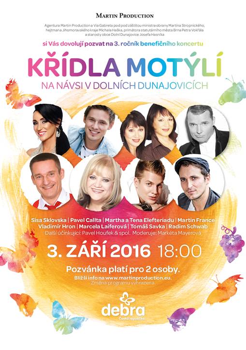 V obci Dolní Dunajovice, krásném jihomoravském městečku, se koná v sobotu 3. září 2016 v rámci 3. ročníku benefiční koncert „Křídla motýlí“, jehož výtěžek je určen pro charitativní organizaci Debra ČR, která pomáhá pacientům s nemocí motýlích křídel a sídlí při Kožním oddělení Pediatrické kliniky Fakultní nemocnice v Brně.