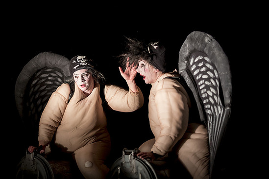 Nikterak náročná, ale působivě hravá scéna s dvěma stylizovanými popelnicemi a obrovskými dveřmi pochází z autorské dílny Michala Kábeleho a Hynka Dřízhala. Obě interpretky andělů v neforemných oranžových kostýmech s masívními černými křídly na zádech se v ní plně realizují.