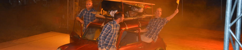 Za scénou slyšíme hluk motoru, malé směšné autíčko, odshora dolů nabalené věcmi, zvesela zavrčí, na pláž přijíždí skupinka nadšených kluků. Mají s sebou surfařská prkna a radostně a hlasitě si zpívají, dovolená začíná…