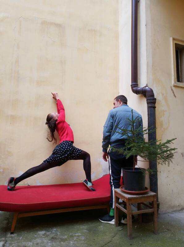 Jak vidno, imaginativní garsonka může vzniknout i kdesi na dvorku u okapu – foto ze zkoušky představení, mimo divadlo