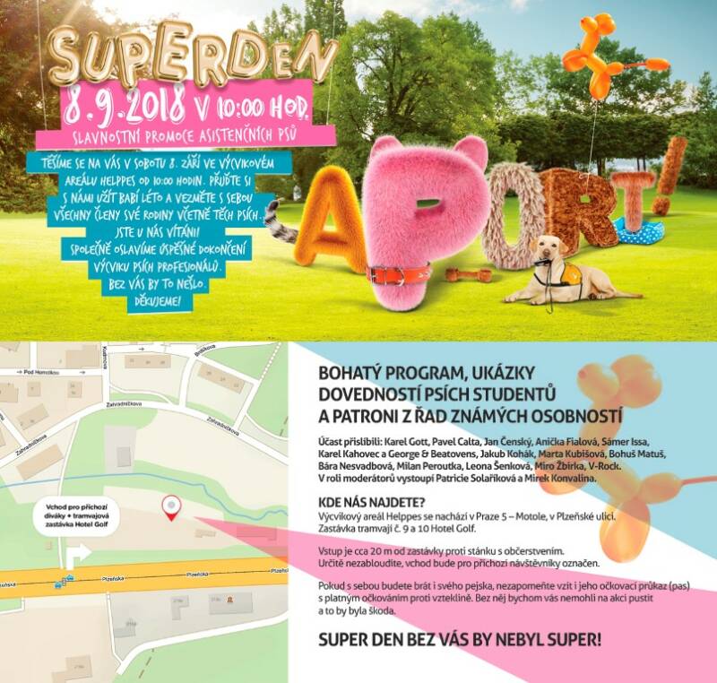 V sobotu 23. září v pražském Motole ve výcvikovém areálu psů spolehlivé veřejně prospěšné organizace s mezinárodní akreditací Helppes proběhne již patnáctý ročník v ČR naprosto ojedinělé veřejné promoce asistenčních, signálních a vodících psů – Super den 2017.