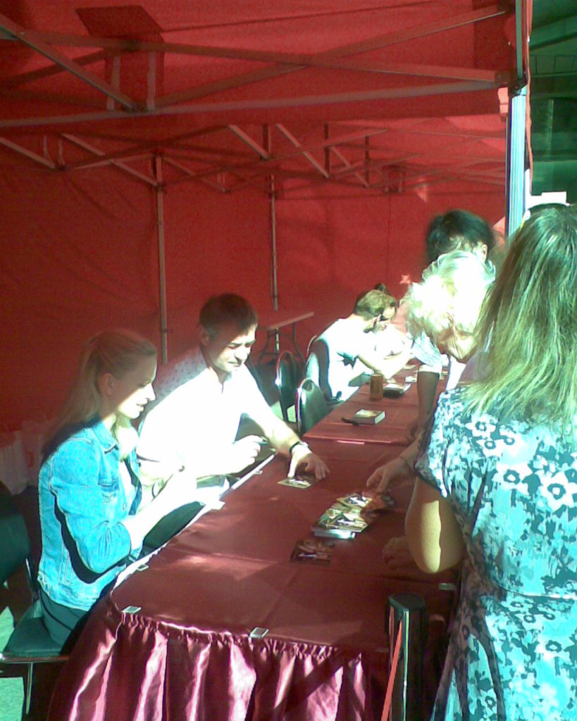 Populární herec Jiří Dvořák (vpravo) se podepisuje, společně se svou taneční partnerkou Lenkou Norou Návorkovou (blíže k objektivu)