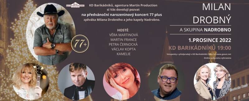 Legenda ještě československé populární hudby Milan Drobný se rozhodl oslavit své 77 + narozeniny se svými přáteli v KD Barikádníků na Praze 10. Půlkulatým narozeninovým koncertem měl slavit už téměř před 3 lety, ale covid tomu tak nechtěl a hlavně je slaví až 8. prosince, kdy mu už bude opravdu 78 let. Ale v první prosincový den mu bude opravdu stále ještě propagovaných 77 +.