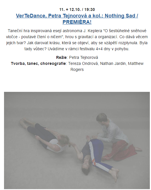 Po dvou letech intenzivního uvádění se představí v Praze naposledy dva taneční projekty režisérky Petry Tejnorové, „Nothing Sad“ 11. prosince ve Studiu ALTA a „Pojďme na tanec“ 12. prosince v divadle PONEC.