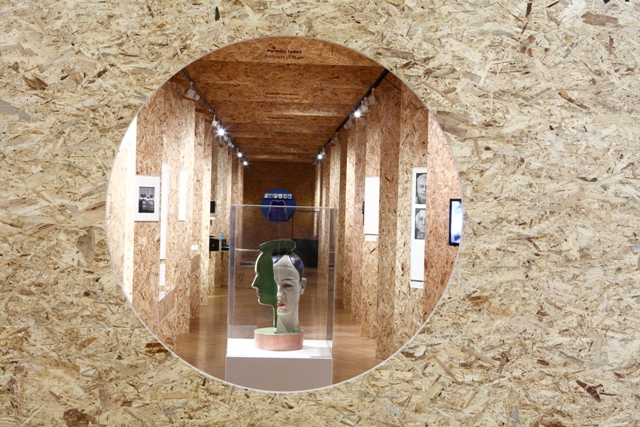 Je velmi diskutabilní, zda se do secesních prostor Obecního domu hodí téměř brutalistická výstavní expozice postavená na drsné dřevotřísce jako dominujícím materiálu?
