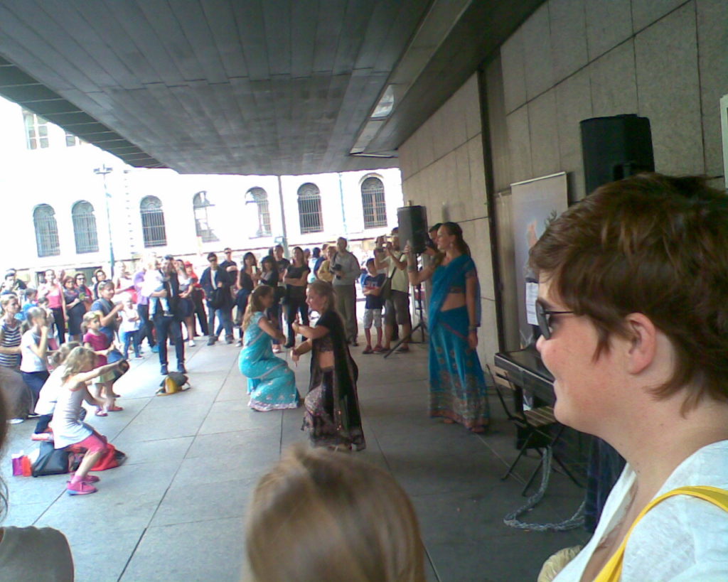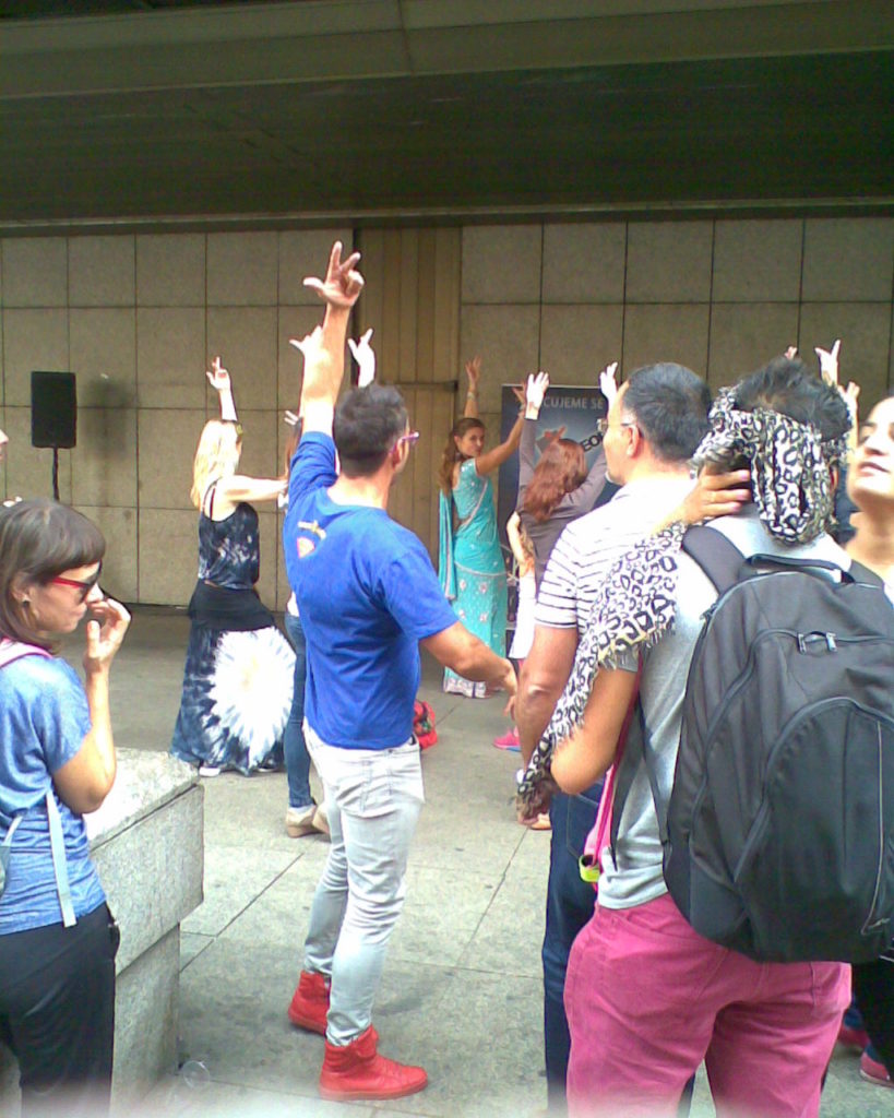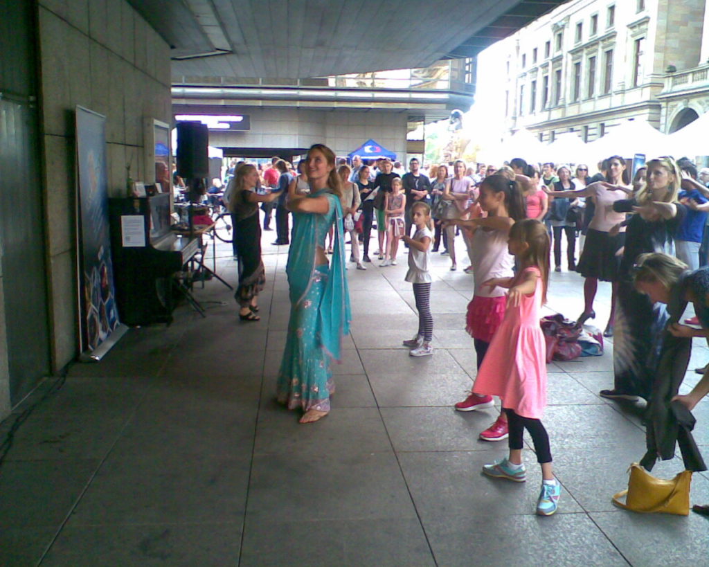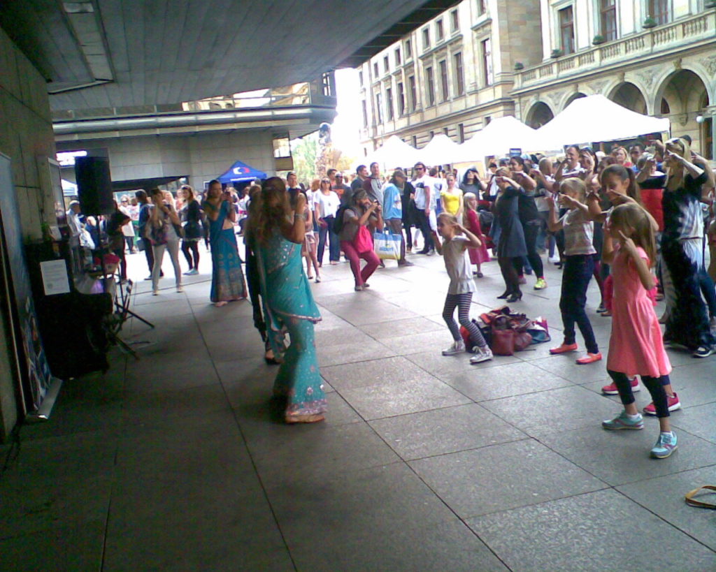 Vystoupení i workshop OM DANCE ACADEMY doslova rozproudily v divácích krev. Po nesmělém počátečním úvodu, kdy indické tóny přehlušovala kapela Zelená konev, z vedlejšího pódia, doslova a do písmene roztančily (v ten den ještě budoucí) Náměstí Václava Havla. Samozřejmě, nebylo to pouze efektními indickými úbory sárí, podmanivými tóny exotických indických nástrojů, ale zejména zkušeností lektorek.