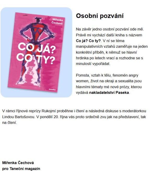 Pozveme vás na novou premiéru, která se uskuteční hned na konci září, otevřeme veřejnosti přístup k filmu Do ticha, který jsme minulý rok představili na Festivalu tanečních filmů, zreflektujeme naši červnovou performativní přednášku Za muže a otevřeme výzvu k účasti na workshopu lotyšské choreografky Mariji Baranauskaite, tentokrát v roli svědků.