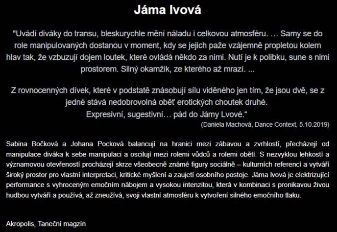 Pozveme vás na novou premiéru, která se uskuteční hned na konci září, otevřeme veřejnosti přístup k filmu Do ticha, který jsme minulý rok představili na Festivalu tanečních filmů, zreflektujeme naši červnovou performativní přednášku Za muže a otevřeme výzvu k účasti na workshopu lotyšské choreografky Mariji Baranauskaite, tentokrát v roli svědků.