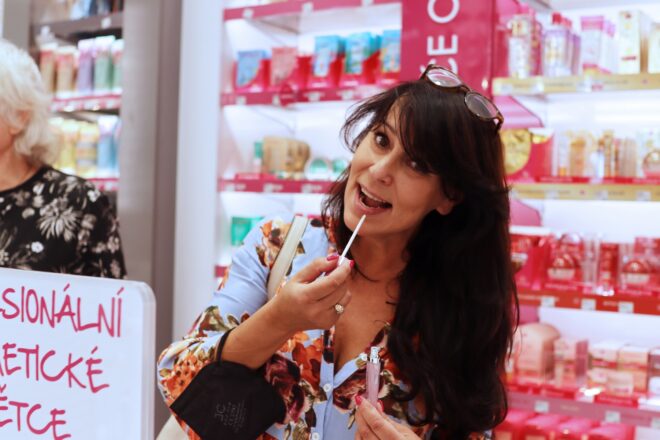 Obě dámy, které v komedii hrají hlavní ženskou postavu stárnoucí herečky byly ve svém živlu a tak vybíraly kosmetiku, seč jim síly stačily, právě proto, aby byly dle názvu inscenace opravdu krásné. A proto za asistence paní prodavačky vybíraly makeupy, rtěnky, řasenky, lesky na rty nebo séra na vlasy a mnoho dalších přípravků, které si odnášely nadšeně v dárkových taškách.