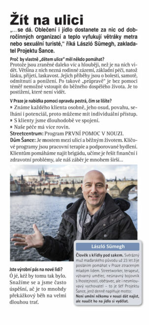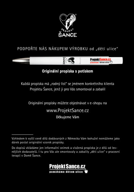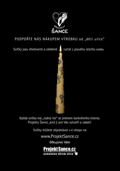 Projekt Šance se snaží 25 let pomáhat českým „dětem ulice“. Díky podpoře dárců provozujeme streetcentrum, kde funguje program První pomoc v nouzi, a Dům Šance, jehož hlavním programem je pracovní terapie, díky které se už mnoho mladých lidí dostalo z ulice. Mají práci, domov a RODINU. Díky Vaší pomoci můžeme pomáhat. Děkujeme Vám. www.ProjektSance.cz